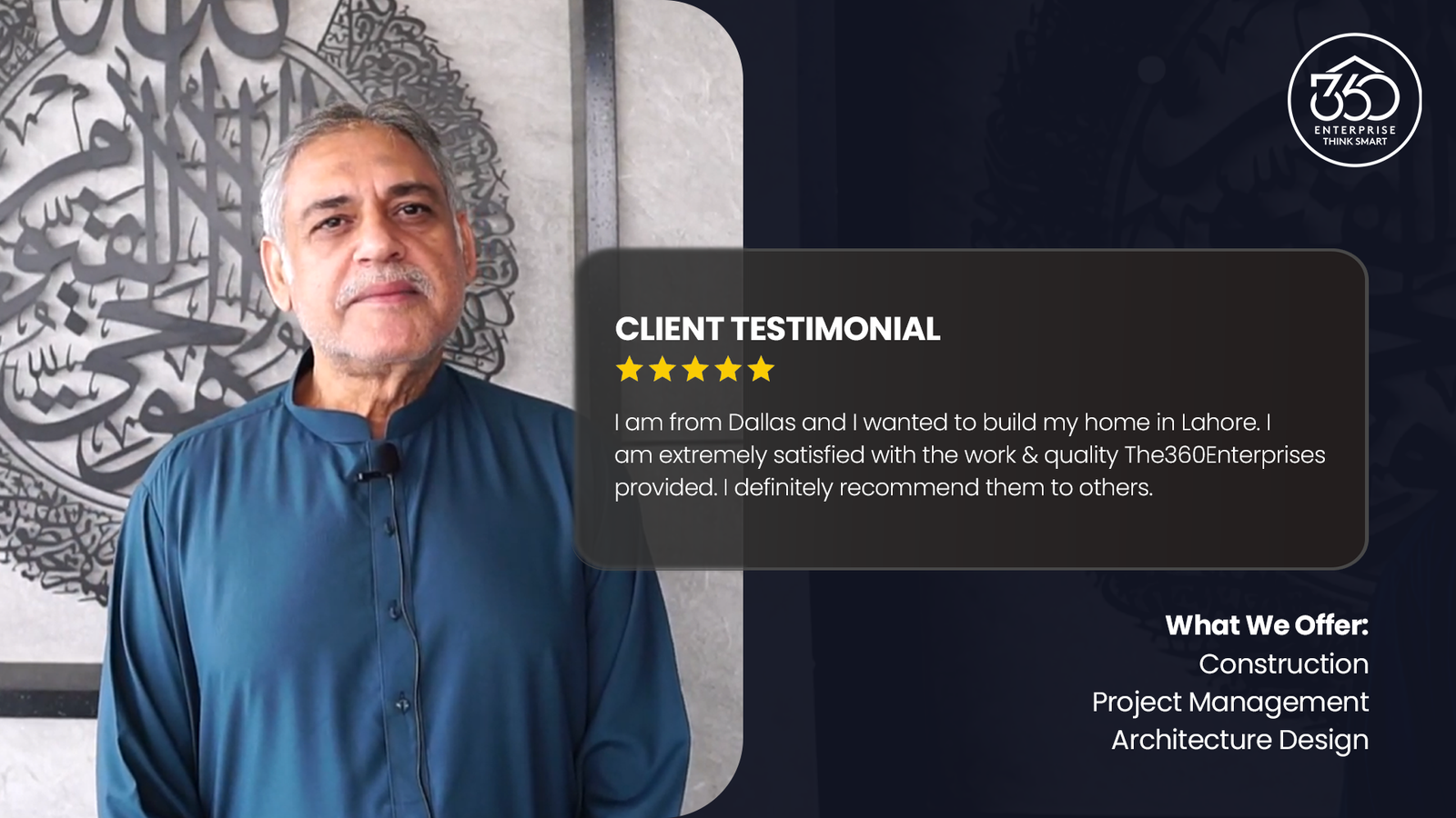 At The 360 Enterprises, we bring over 13 years of experience in architecture design, construction, renovation, and project management, not only across Pakistan but also for our overseas clients in the Middle East and the USA who wish to build their homes in Pakistan. Our expert team of engineers, project managers, and construction professionals has successfully delivered a wide range of projects, from luxury homes to large-scale commercial developments. We specialize in providing practical, cost-effective, and long-term solutions, ensuring that each project meets the highest standards. With our third-party project management expertise, we guarantee quality, transparency, and client satisfaction at every stage, making us a trusted partner for clients worldwide. We blend innovation, smart design, and efficient execution to create spaces that endure.